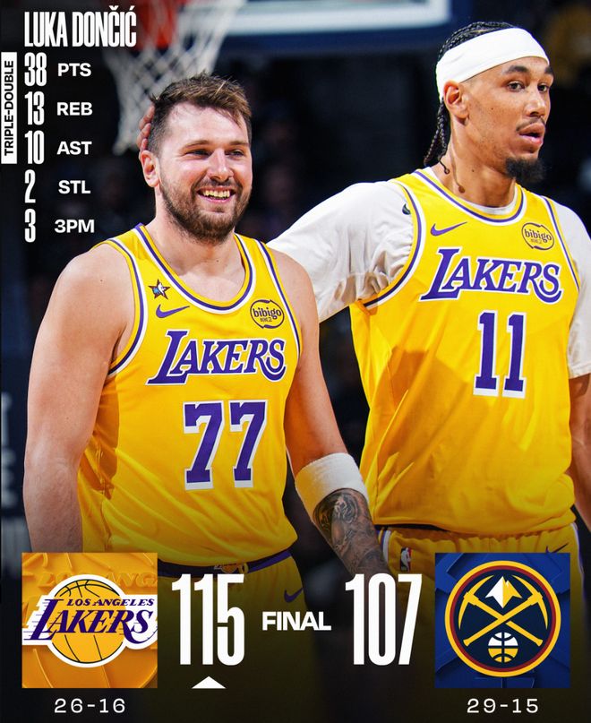 湖人115-107逆轉(zhuǎn)掘金 東契奇38+13+10詹姆斯準(zhǔn)三雙