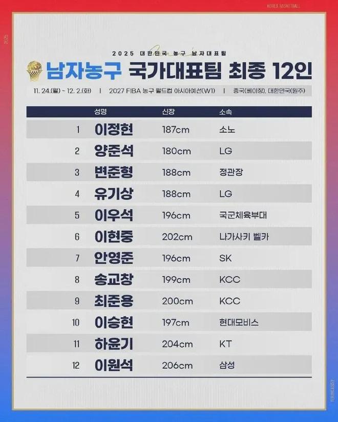 韓國男籃則早早公布了對陣中國男籃的12人大名單,最高2米06,由他們的當(dāng)家球星李賢重領(lǐng)銜,兩隊將繼今年亞洲杯八強賽之后再次相遇,如下: