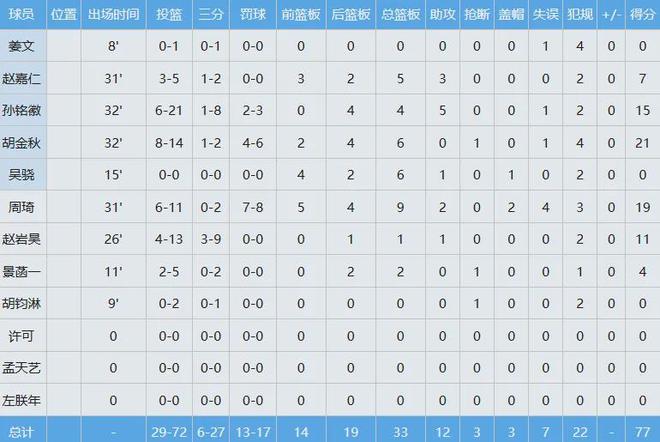 周琦+胡金秋,合砍40分15板都于事無補(bǔ),孫銘徽(投籃21中6)為首的外線群把籃筐砸爛,全隊(duì)三分球27中6,命中率低至可憐的約22%。