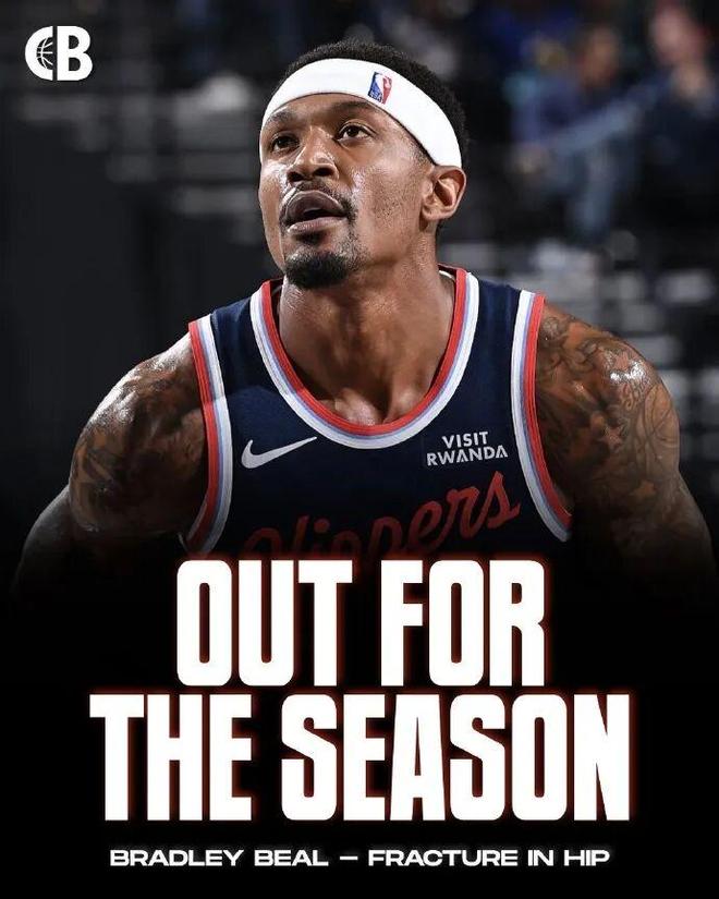 Shams一條新聞?chuàng)舫量齑?,?jù) ESPN 消息人士透露,快船后衛(wèi)布拉德利-比爾髖部骨折,將接受手術(shù),賽季報(bào)銷,恢復(fù)時(shí)間6-9月。