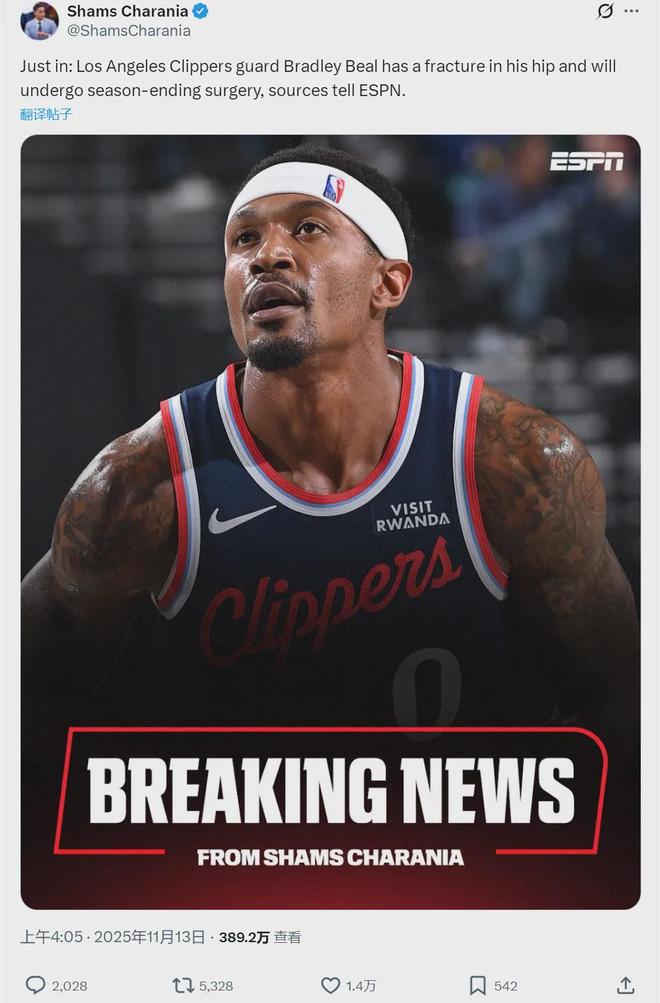今天早些時候據NBA名記Shams報道,快船后衛(wèi)布拉德利·比爾遭遇了髖部骨折,他是在上周末跟太陽的比賽里受傷的。