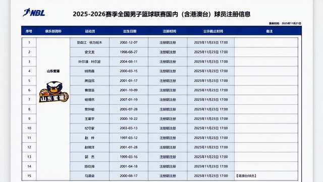 山東蜜獾男籃是在11月22日上午公布的15人注冊(cè)名單,這15人分別是:亞森江-依力哈木、史文龍、葉爾潘-葉爾波、姚雨鑫、席益民、曹晉昌、楊博然、焦鐘毅、王星宇、紀(jì)守家、趙燁、趙錦洋、郭杰、陳玖璋和馬港燊。