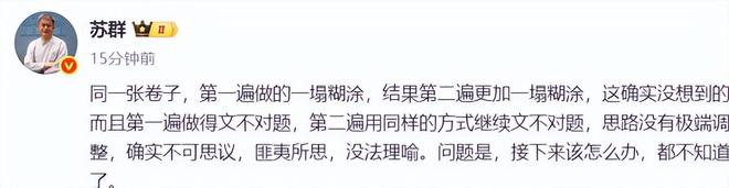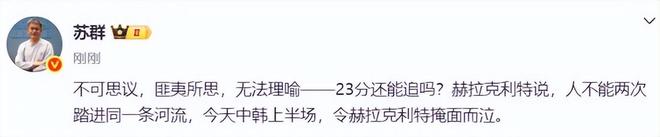 到整個(gè)半場(chǎng)結(jié)束人家韓國隊(duì)直接52-29領(lǐng)先,這個(gè)分?jǐn)?shù)就連蘇群都忍不住了,直接發(fā)文表示不可思議。