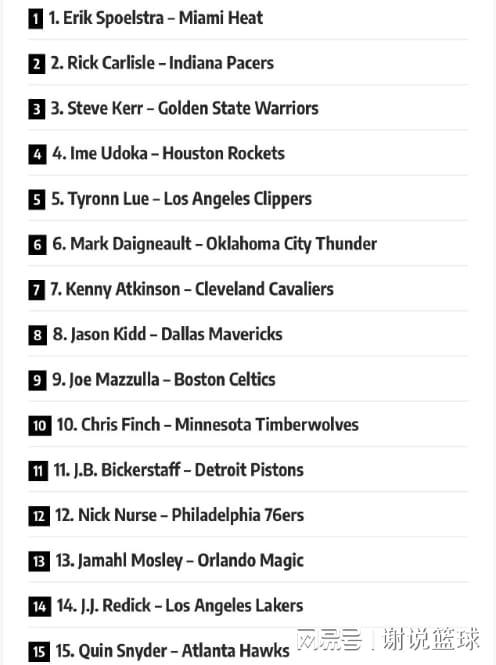 而美媒也給各隊(duì)主帥,進(jìn)行了相關(guān)排名。其中勇士主帥科爾僅次于斯波和卡萊爾,進(jìn)入了榜單前三名。湖人雷迪克作為菜鳥教練,上賽季才正式出山,所以他僅排在第14位,倒也沒有太大問題,甚至可以說美媒夠客氣了。