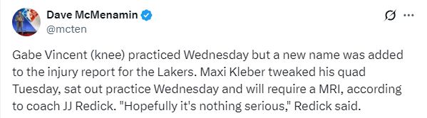 可是湖人又傷一人,湖人隊(duì)記Dave McMenamin報(bào)道,湖人主帥雷迪克透露,克萊伯在周三的訓(xùn)練中拉傷了股四頭肌,今日沒(méi)有參加訓(xùn)練,他將需要接受MRI檢查,雷迪克希望他的傷勢(shì)沒(méi)什么大礙。
