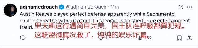 而在這當中,湖人里夫斯一人就獲得了高達22次罰球,而他也是迎來了生涯之夜。全場22投11中,三分球9中5,22罰21中,爆砍生涯新高的51分,外加11籃板9助攻,打出了一場史詩級別的表現(xiàn)??捎捎诹P球數(shù)的關(guān)系,也遭到了很多質(zhì)疑,美國網(wǎng)友就直言:“里夫斯這待遇完美,國王隊連呼吸都算犯規(guī),這聯(lián)盟徹底沒救了?!?/p>