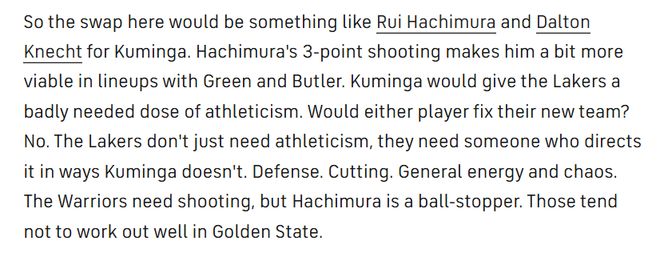 但這筆交易能讓兩支球隊的問題得到根治嗎?答案是否定的。湖人隊需要的不只是運動能力,他們更需要一個能將這種優(yōu)勢轉化到防守、無球切入,以及用積極性攪亂對手防線的球員——而這恰恰是庫明加不擅長的。勇士隊則需要外線火力,可八村壘是個持球停滯點,這種類型的球員在勇士的體系里往往很難立足。