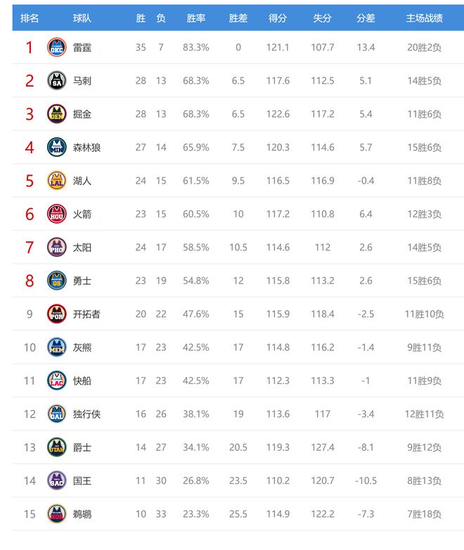 今日比賽后馬刺、掘金排名互換,其他西部球隊(duì)排名不變。
