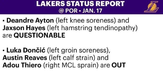 根據(jù)湖人官方公布的傷病報(bào)告,東契奇(左側(cè)腹股溝酸痛)、里夫斯(左小腿拉傷)和蒂耶羅(右膝內(nèi)側(cè)副韌帶扭傷)休戰(zhàn),艾頓(左膝酸痛)與海斯(左腿筋肌腱炎)出戰(zhàn)成疑。