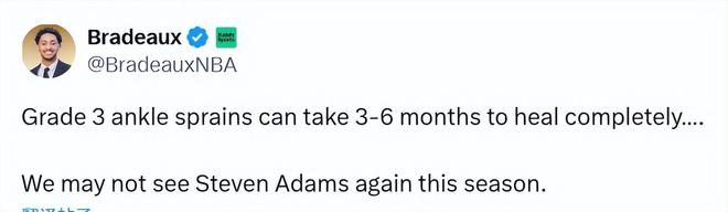 北京時(shí)間1月21日,休斯頓火箭隊(duì)中鋒史蒂文-亞當(dāng)斯將無限期缺陣。在球隊(duì)今日迎戰(zhàn)圣安東尼奧馬刺隊(duì)的賽前采訪中,主帥烏度卡宣布,亞當(dāng)斯遭遇了左腳踝三級扭傷。這位火箭隊(duì)主教練表示,這名內(nèi)線大將的歸期目前尚未確定。隊(duì)記表示,三級腳踝扭傷預(yù)計(jì)需休戰(zhàn)3-6個(gè)月,有可能賽季報(bào)銷。