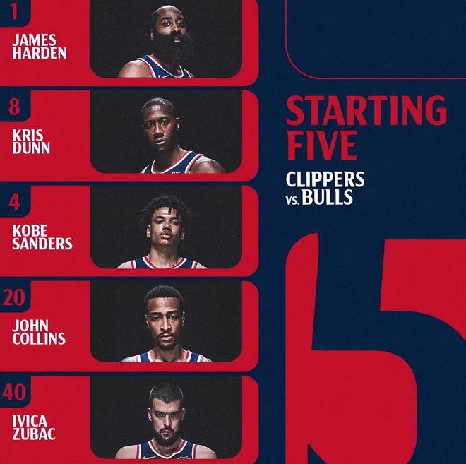 首發(fā)陣容方面,快船隊這邊,比爾、波格丹和小瓊斯均無法出場,保羅繼續(xù)未隨隊,倫納德也不打,泰倫盧排出的最新首發(fā)五人組為:克里斯-鄧恩、科比-桑德斯、詹姆斯-哈登、科林斯、祖巴茨;公牛隊這邊,吉迪缺陣,首發(fā)陣容則為:懷特、杰倫-史密斯、奧科羅、布澤利斯、武切維奇。