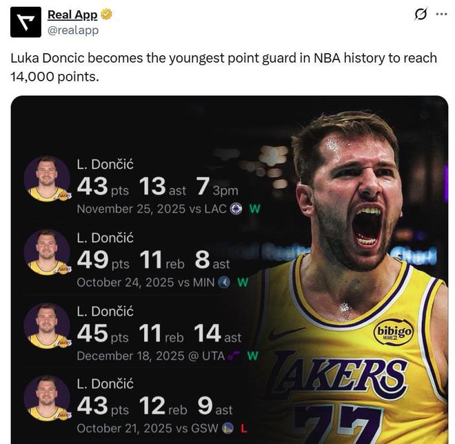 除此之外,本場(chǎng)比賽也是東契奇生涯14000分里程碑之夜,26歲327天的東契奇成為NBA歷史上拿到至少14000分最年輕的控衛(wèi)。