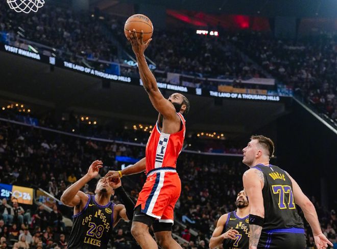 湖人數(shù)據(jù),東契奇32分11籃板8助攻,詹姆斯23分6助攻4失誤,斯瑪特10分4助攻,八村塁12分3籃板,艾頓4分5籃板??齑瑪?shù)據(jù),哈登18分7籃板10助攻7失誤,小卡24分5籃板4助攻,科林斯13分5籃板,祖巴茨18分19籃板,米勒14分3籃板,大洛佩茲10分2籃板,桑德斯11分4籃板。