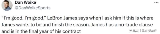 知名記者沙姆斯·查拉尼亞(Shams)在播客中分析道:“現(xiàn)實(shí)情況是,我們或許正在見(jiàn)證勒布朗·詹姆斯與湖人隊(duì)這段關(guān)系的漸行漸遠(yuǎn)。無(wú)論是在本賽季結(jié)束后出現(xiàn)變故,還是他決定以自由球員身份另覓新東家……”知名體育評(píng)論領(lǐng)域資深記者文霍斯特透露:“勒布朗·詹姆斯在下個(gè)賽季面臨著三種抉擇路徑。其一,他可選擇降低薪資,繼續(xù)留在湖人隊(duì)效力;