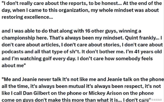 當(dāng)被問(wèn)到近期是否與珍妮·巴斯有過(guò)交流時(shí),詹姆斯的回答十分干脆:“我們之間幾乎沒(méi)什么交流。我不明白,其實(shí)我和珍妮之前也很少打電話溝通,你們應(yīng)該也沒(méi)見(jiàn)過(guò)相關(guān)的報(bào)道吧。我不會(huì)把這種事小題大做,我們彼此尊重,雙方一直保持著良好的合作關(guān)系。但我也不會(huì)特意給她,就像我從未給熱火隊(duì)老板米奇·阿里森或者騎士隊(duì)老板吉爾伯特打過(guò)電話一樣。得了吧,各位,別把這事兒無(wú)限放大了,我真的不在乎?!?/p>