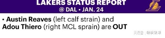 如今湖人官方更新傷病報告,客場對陣獨行俠,依然只有里夫斯和蒂耶羅,還留在傷病名單當(dāng)中,其他球員全部可以出戰(zhàn)。當(dāng)然湖人主帥雷迪克,在接受采訪時已經(jīng)透露,如果里夫斯恢復(fù)情況良好,他有望在這波連續(xù)客場征程中復(fù)出。