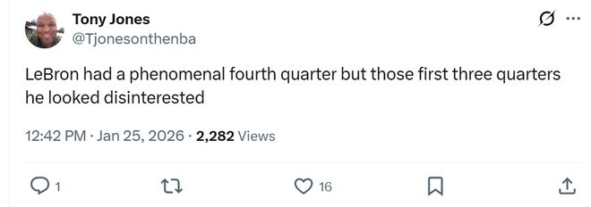 面對詹姆斯這樣的表現(xiàn),記者Tony Jones賽后精準評價道:“勒布朗在末節(jié)打出驚艷表現(xiàn),但他在前三節(jié)看起來完全提不起興趣?!?/p>