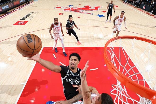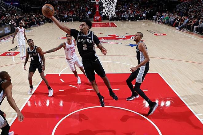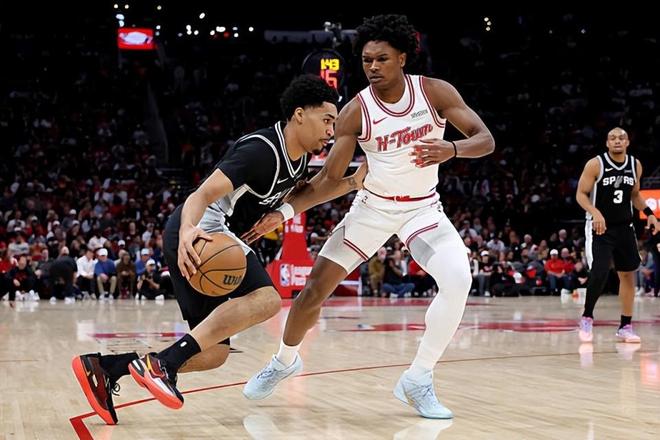 本場(chǎng)比賽中,馬刺的替補(bǔ)后場(chǎng)新秀迪倫-哈珀(Dylan Harper)的表現(xiàn)令人刮目相看。哈珀全場(chǎng)出場(chǎng)22分03秒,投籃11中8,三分線外2中0,得到了16分4籃板3助攻1蓋帽的數(shù)據(jù),還有2次失誤和1次犯規(guī),正負(fù)值為+18。哈珀在進(jìn)攻端不斷通過(guò)自己的突破完成得分,他不斷給對(duì)手內(nèi)線制造沖擊,展現(xiàn)出了超強(qiáng)的侵略性和終結(jié)能力,他也是靠著幾乎同樣的方式拿到了不少的分?jǐn)?shù)。即使是在中遠(yuǎn)距離投籃依然不準(zhǔn)的情況下,他還是得到了不少的分?jǐn)?shù)。除此之外,哈珀在傳球和組織方面的表現(xiàn)也是具備一定的亮點(diǎn)的,他在防守端的表現(xiàn)也是相當(dāng)不錯(cuò)的。不夸張地說(shuō),馬刺能夠在比賽第四節(jié)拉開(kāi)比分并且奠定優(yōu)勢(shì),也和哈珀的出色表現(xiàn)密切相關(guān)。