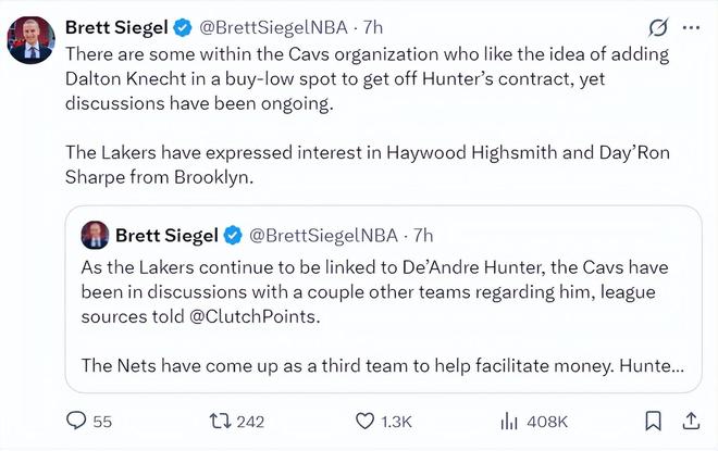 在Brett Siegel的報道中,湖人隊有意在交易截止日得到的球員還不止亨特一人,籃網(wǎng)隊的海史密斯、夏普也是意中人。