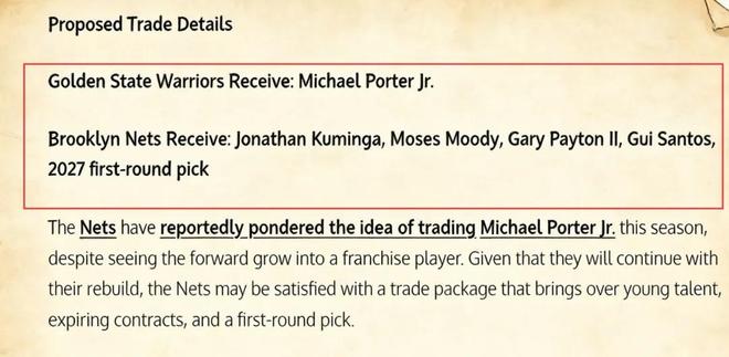 美媒《Fadeaway World》更是提出了一套5換1的交易方案,建議勇士打包送出穆迪、庫明加、桑托斯、小佩頓以及2027年的首輪簽,從籃網(wǎng)引入小波特。