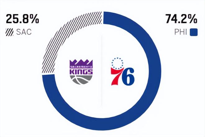 這是兩隊本賽季的第一次交鋒,在最近五次交手中,76人取得了3勝2負(fù),占據(jù)一定心理優(yōu)勢。賽前,美媒ESPN對本場比賽進(jìn)行了勝率預(yù)測,國王勝率僅有25.8% ,劣勢明顯,76人隊勝率則高達(dá)74.2% 。