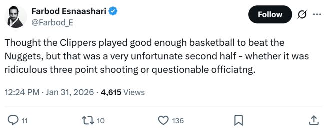 正如賽后快船記者Farbod Esnaashari所說(shuō):“盡管快船本場(chǎng)比賽的表現(xiàn)足以擊敗掘金,但下半場(chǎng)的狀況的確艱難,不僅要面對(duì)離譜的三分投射效率,還要應(yīng)對(duì)頗具爭(zhēng)議的吹罰尺度。”