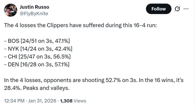 而對(duì)手三分投射的命中率也是快船隊(duì)過(guò)去20場(chǎng)比賽的勝負(fù)手,當(dāng)快船隊(duì)取勝時(shí)對(duì)手三分命中率僅為28.4%,輸球時(shí)對(duì)手的三分命中率則高達(dá)52.7%。