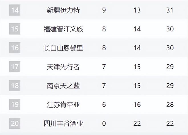 14-20分別是新疆、福建、吉林、天津、同曦、江蘇和四川。新疆這輪擊敗四川,不過窗口期對他們非常重要,看看格蘭能不能建立好的攻守體系。福建、吉林、天津、同曦、江蘇這輪全部都輸球了,特別是吉林已經(jīng)三連敗,估計福建和吉林的戰(zhàn)績會持續(xù)下跌。至于同曦,這輪郭昊文沒有打,導致他們潰敗上海。天津和江蘇最近的趨勢不錯,但分別輸給了遼寧和深圳,但后續(xù)依然有希望成為攪局者。四川22連敗,氣勢越來越低了。