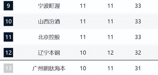 青島、北京和浙江排在6-8,他們的差距不是很大。特別是青島擊敗北京之后止住頹勢,別忘了之前他們五連敗。北京現(xiàn)在已經(jīng)兩連敗了,排名相比于上輪再下降一名?,F(xiàn)在他們的磨合出現(xiàn)大問題,許利民的用人也是一大弊端。浙江輸給廣廈,還是實力上的差距。