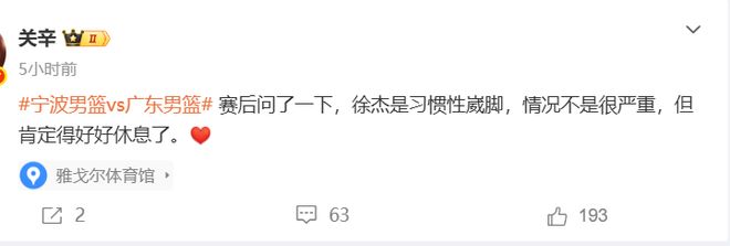 徐杰再一次傷到了腳踝,據(jù)賽后跟隊(duì)記者關(guān)辛的報(bào)道,關(guān)師傅確認(rèn)了徐杰的傷病情況——習(xí)慣性崴腳,情況不是很?chē)?yán)重,但肯定得好好休息了。