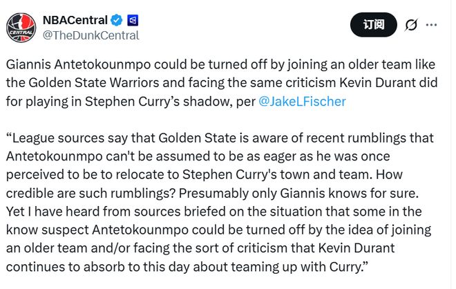 “聯(lián)盟消息人士透露,勇士方面已察覺到近期的一些流言:外界此前默認(rèn)字母哥會(huì)迫切渴望加入庫里所在的球隊(duì)、來到這座城市,但事實(shí)可能并非如此。這類流言的可信度究竟有多高?想必只有字母哥本人最清楚。不過,據(jù)知情人士透露,一些圈內(nèi)人猜測(cè),字母哥或許會(huì)打退堂鼓 —— 一方面是因?yàn)橛率筷嚾菽挲g偏大,另一方面則是他不想落得和杜蘭特一樣的下場(chǎng),至今仍因當(dāng)年聯(lián)手庫里而飽受詬病?!?/p>