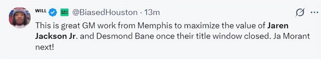 休媒發(fā)來贊譽:這是來自孟菲斯灰熊的一次出色運作,他們最大的限度的發(fā)揮了貝恩、小賈倫兩人的交易價值,接下來肯定是莫蘭特了。