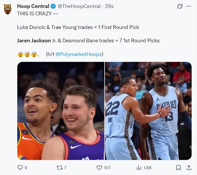美媒Hoop Central寫道:這太瘋狂了,東契奇、特雷楊只換來一個首輪,而小賈倫+貝恩則換到了7個首輪簽。
