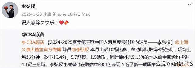 2025年1月,李弘權(quán)憑借12月的月度最佳表現(xiàn),代表上海出戰(zhàn)10場比賽,取得8勝2負(fù)的戰(zhàn)績,場均上場36分鐘,砍下19.4分、5.7籃板、1.9助攻,同時(shí)能夠以51.3%的驚人命中率場均投進(jìn)4.1記三分球。李弘權(quán)也憑借他在聯(lián)賽中的出色表現(xiàn)入選了新一期國家集訓(xùn)隊(duì)。
