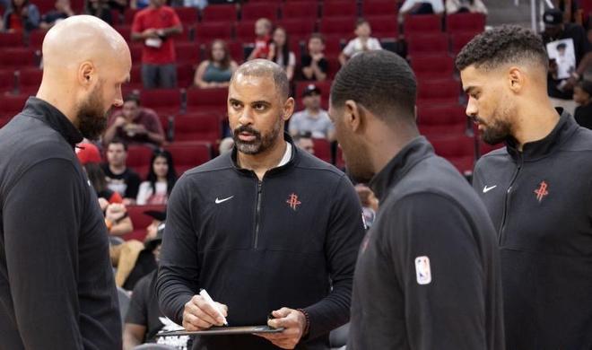 這樣的大陣容與火箭的大陣容又完全不同,火箭的大陣容是亞當(dāng)斯+申京+阿門+史密斯+杜蘭特。