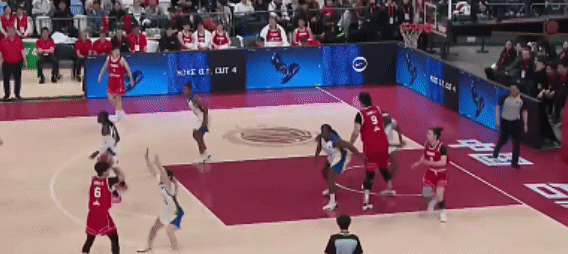 比賽開始:陳明伶跳球,球權(quán)給到張曼曼,中國隊的第一次進攻被對手限制住。但是很快的,楊舒予一個快速突破,上籃拿分: