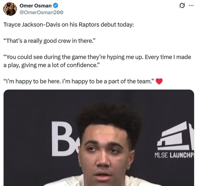 賽后TJD談及首秀表現(xiàn)時(shí)坦言:“猛龍是一支非常出色的隊(duì)伍,你們可以看到比賽中他們一直都在為我加油,每一次我完成快攻,他們都給我很大的信心,真的很高興來到這里,成為團(tuán)隊(duì)的一員?!?/p>