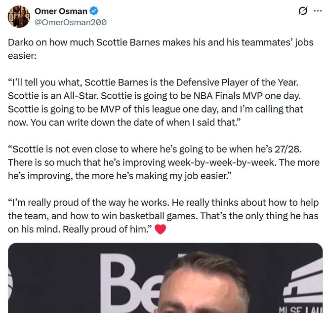 面對巴恩斯這樣的表現(xiàn),猛龍隊(duì)主帥拉賈科維奇猛夸到:“我跟你說,巴恩斯是年度最佳防守球員,他是全明星球員,總有一天他會(huì)成為FMVP,也會(huì)成為這個(gè)聯(lián)盟的MVP,你們可以記下我說這番話的日期。”