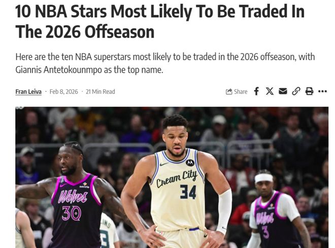 準(zhǔn)備開(kāi)搶!在季中交易截止日結(jié)束后,字母哥這條大魚(yú)并沒(méi)有改換門庭,美媒《FW》也曬出26年休賽期最有可能被交易的10條大魚(yú),其中數(shù)人成火箭隊(duì)潛在交易目標(biāo)。