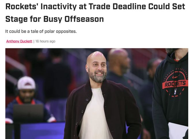 針對(duì)這種情況,美媒《Sports Illustrated》給出完全不同的看法,認(rèn)為火箭隊(duì)0操作并非是斯通無(wú)能,而是休城為了休賽期蓄力追求字母哥、小卡等超級(jí)巨星做準(zhǔn)備。