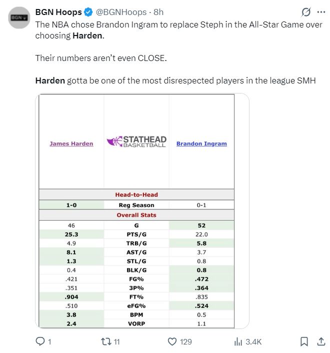 美媒BGN Hoops 寫道,哈登居然沒有被選為全明星,這簡(jiǎn)直是徹頭徹尾的打劫,蕭華選英格拉姆頂替庫(kù)里參與全明星而不選哈登,這兩人的表現(xiàn)根本不是一個(gè)等級(jí)的,哈登是這個(gè)聯(lián)盟最不受尊重的球星之一,太無語了。