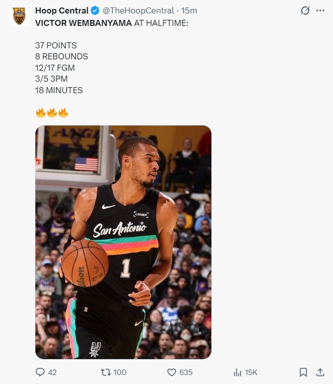 9.文班亞馬上半場(chǎng)37分賽季新高,此前是哈登半場(chǎng)35分;