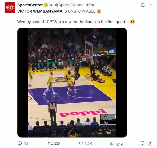 首節(jié)開(kāi)場(chǎng)文班亞馬就開(kāi)始上演表演秀,轉(zhuǎn)身過(guò)掉拉拉維亞直接單手劈扣,開(kāi)場(chǎng)5中5,三分3中3拿到17分。