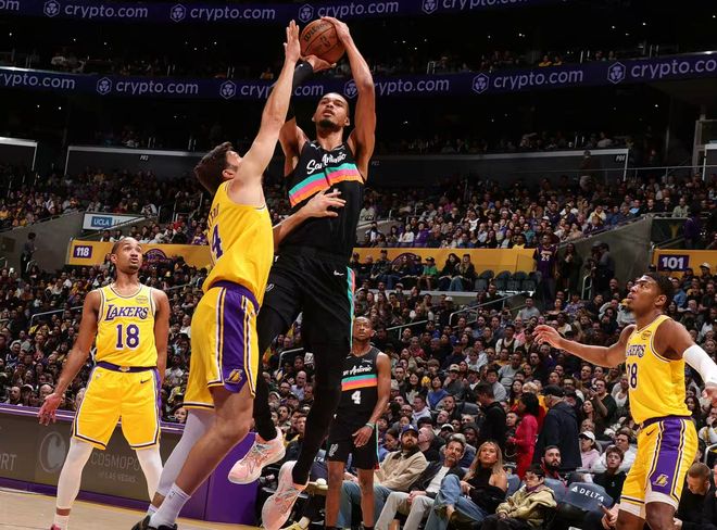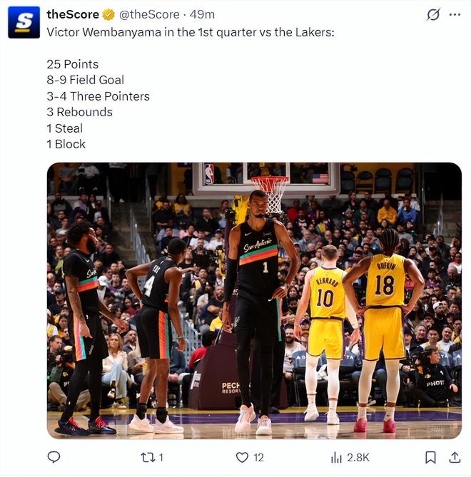 首節(jié)文班亞馬7分59秒,9中8,三分4中3,拿到25分3籃板1搶斷1蓋帽,文班亞馬攻防一體一人吊打湖人全隊(duì)。