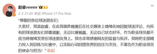 他表示,無論比賽輸贏,無論狀態(tài)好壞,作為職業(yè)球員都不應(yīng)當(dāng)將情緒發(fā)泄在球迷朋友身上。非常感謝網(wǎng)友的監(jiān)督與批評,我將把全部精力投入到訓(xùn)練與比賽中,以實(shí)際行動回饋各界的信任與支持,不辜負(fù)作為職業(yè)球員的使命與擔(dān)當(dāng)。