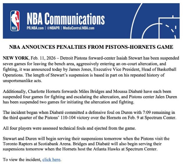 活塞球員斯圖爾特和杜倫的禁賽,將從2月12日開始執(zhí)行,他們將無緣活塞客場對陣猛龍的比賽,之后也將繼續(xù)禁賽。至于布里奇斯和迪亞巴特的禁賽,也將從2月12日開始執(zhí)行,屆時黃蜂主場迎戰(zhàn)老鷹。
