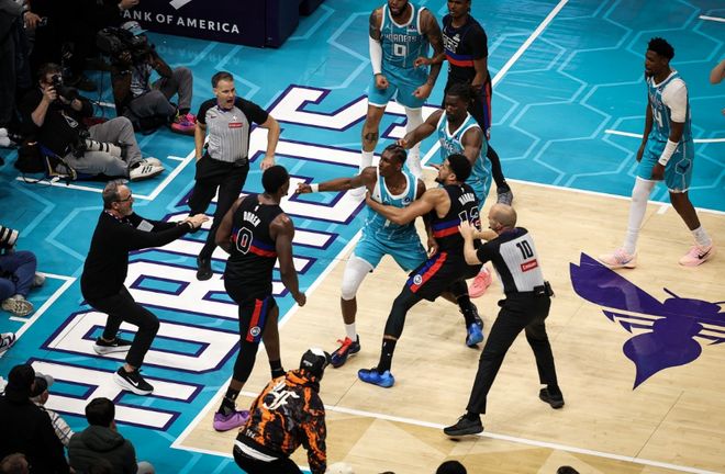 在該場比賽進行到第三節(jié)時,雙方爆發(fā)大規(guī)模沖突。先是杜倫與迪亞巴特兩位內線發(fā)生肢體沖突,其中杜倫掌摑迪亞巴特的面部,他追著杜倫要打引發(fā)沖突。隨后斯圖爾特與布里奇斯加入進來,尤其是斯圖爾特隨后再次沖進場內追打布里奇斯,也是引發(fā)雙方第二輪的沖突,而迪亞巴特隨后被工作人員拉走,四位球員當時全部被驅逐離場。