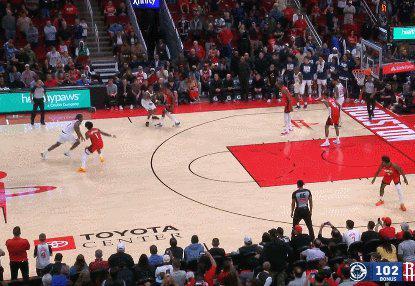 比賽還剩7.2秒時,申京2罰1中幫助火箭扳平比分??焱和:箜樌麑⑶虬l(fā)到了萊昂納德手中,在他接球的瞬間,快艇有三名球員留在球場左側(cè),讓空間威脅足夠大的布魯克·洛佩斯一個人站在右底角,這擺明了是讓萊昂納德突右路完成一記自己最擅長的中距離投籃。