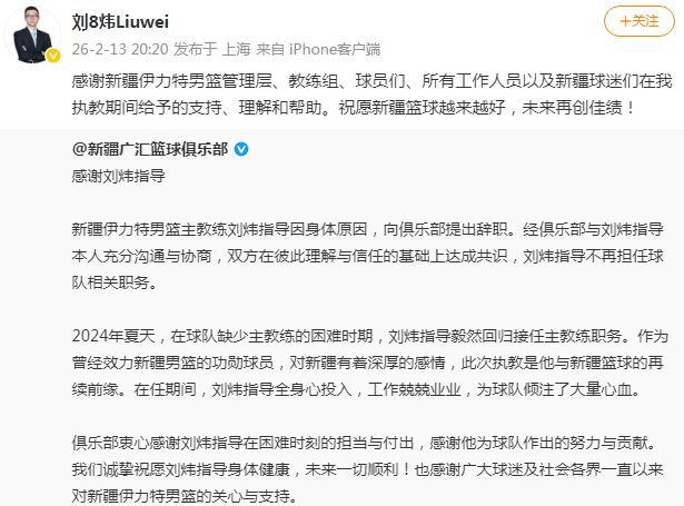北京時間2月13日,在新疆男籃官方發(fā)布公告,宣布劉煒指導(dǎo)因為身體原因請辭,不再擔(dān)任球隊相關(guān)職務(wù)。劉煒通過社媒發(fā)聲回應(yīng),感謝新疆伊力特男籃管理層、教練組、球員們、所有工作人員以及新疆球迷。