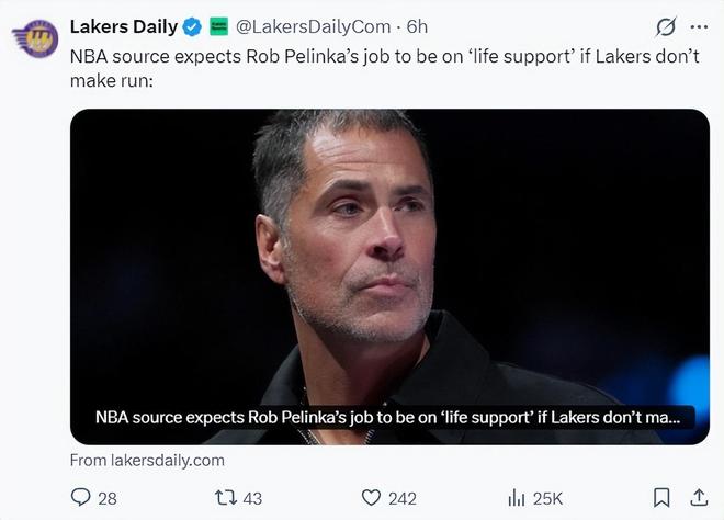 湖媒Lakers Daily甚至表示佩林卡可能已經(jīng)進(jìn)入了下課倒計(jì)時(shí),一旦湖人隊(duì)下半賽季、季后賽的戰(zhàn)績不佳,又在休賽期顆粒無收,那么湖人新老板沃爾特很有可能就要對湖人管理層進(jìn)行清洗,所以佩林卡已經(jīng)開始著手休賽期。